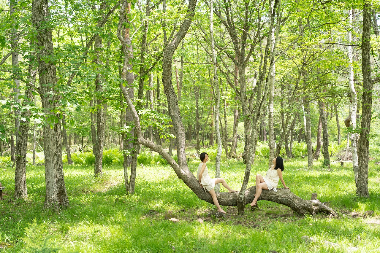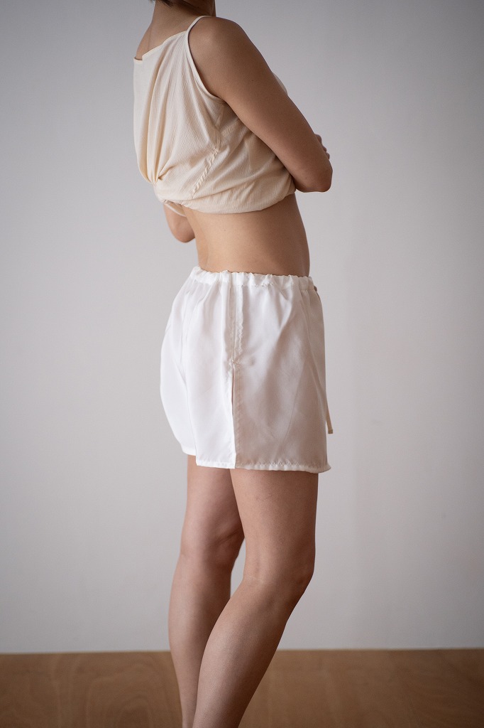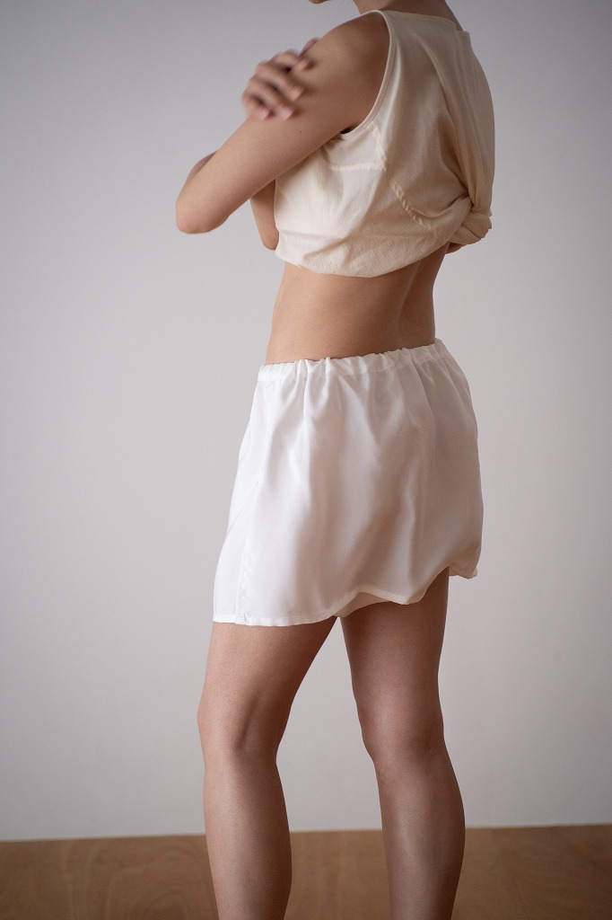 白色は羽二重シルク。グレーっぽい色のワッフル地のパンツはリネンです。